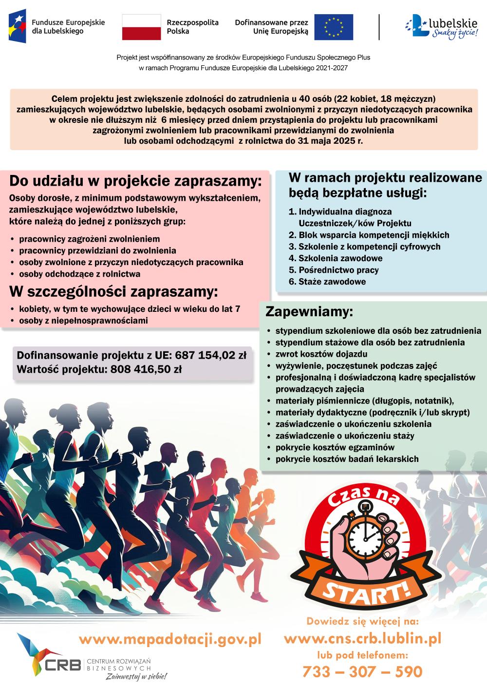 W związku z realizacją projektu pn. „Czas na start!” nr projektu: FELU.09.07-IP.02-001/23 w ramach Programu Fundusze Europejskie dla Lubelskiego 2021-2027, Priorytetu IX Zaspokajanie potrzeb rynku pracy, Działania 9.7 Outplacement, przekazujemy Państwu informację na temat powyższego projektu. Celem projektu jest zwiększenie zdolności do zatrudnienia u 20 osób (12K,8M) zamieszkałych (w rozumieniu KC) woj. lubelskie, zwolnionych z przyczyn niedotyczących pracownika w okresie do 6 miesięcy.