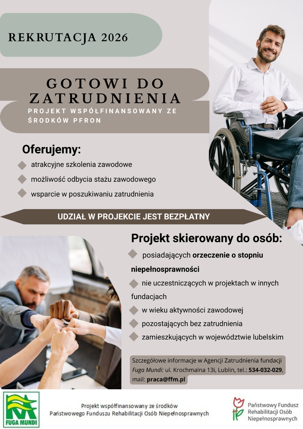 Fundacja Fuga Mundi zaprasza osoby z orzeczonym stopniem niepełnosprawności do uczestnictwa w projekcie „Gotowi do zatrudnienia” współfinansowanego ze środków