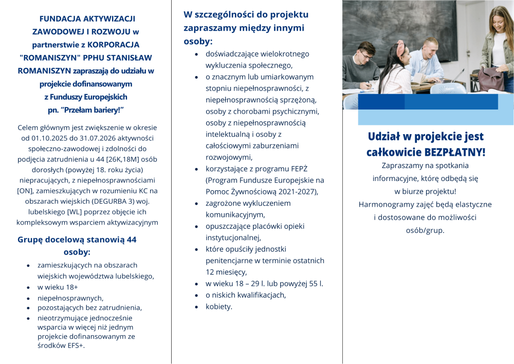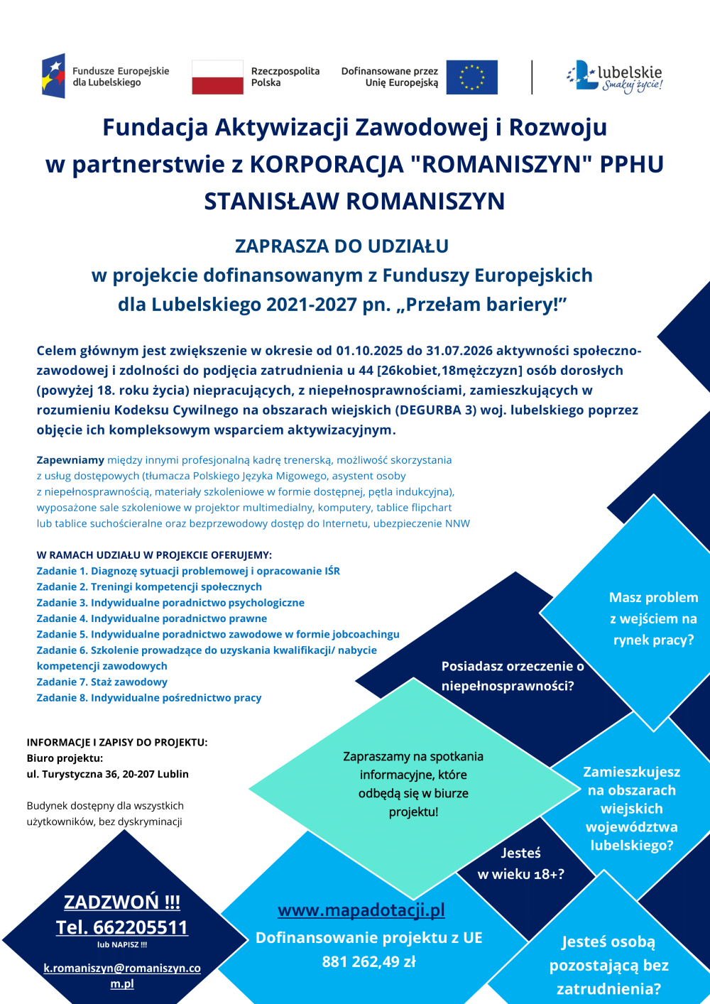 Fundacja Aktywizacji Zawodowej i Rozwoju z siedzibą w m. Piła, ul. Różana Droga 1A wraz z Partnerem KORPORACJA "ROMANISZYN" PRZEDSIĘBIORSTWO PRODUKCYJNO-HANDLOWO USŁUGOWE STANISŁAW ROMANISZYN z siedzibą w m. Piła, ul. Różana Droga 1A, informują, że realizują na obszarze województwa lubelskiego projekt pn. „Przełam bariery!” nr FELU.08.01-IP.02-0080/24, współfinansowany ze środków Unii Europejskiej w ramach Funduszu Europejskiego dla Lubelskiego na lata 2021-2027 wsparcie udzielane z Europejskiego Funduszu Społecznego Plus. Program FELU.00.00, Priorytet FELU.08.00, Działanie FELU.08.01.