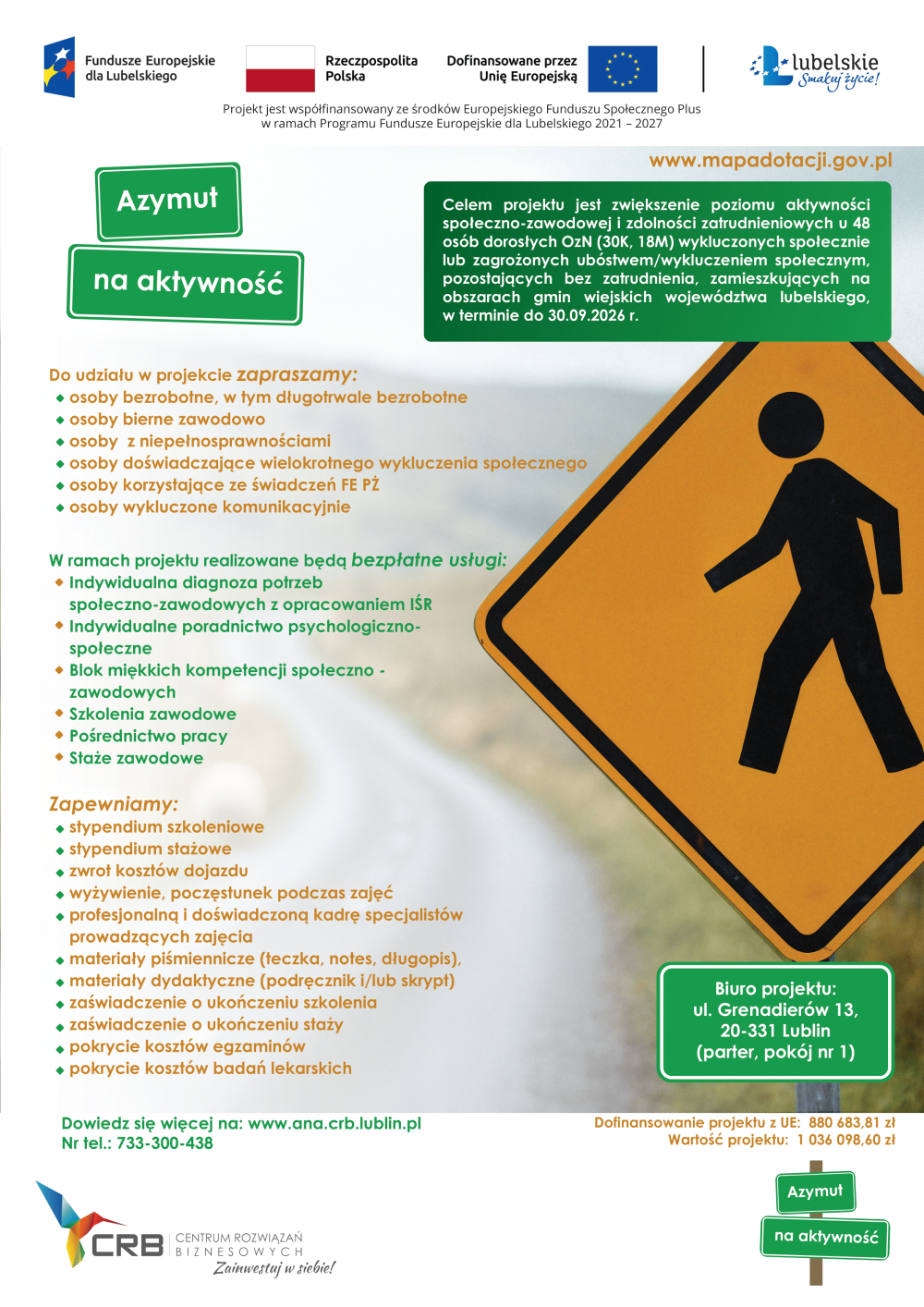 W związku z realizacją projektu w ramach Osi Priorytetowej VIII Zwiększenie spójności społecznej, Działania 8.1 Aktywizacja społeczna i zawodowa programu Fundusze Europejskie dla Lubelskiego 2021-2027 pn. „Azymut na aktywność” nr projektu: FELU.08.01-IP.02-0068/24 oraz obowiązkiem informacyjnym wynikającym z umowy o dofinansowanie podpisanej z Wojewódzkim Urzędem Pracy w Lublinie przekazujemy Państwu informację na temat powyższego projektu.